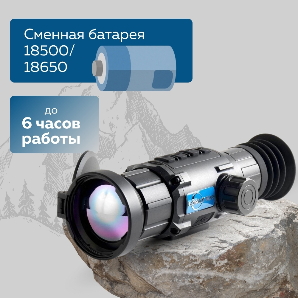 Прицел оснащён двумя аккумуляторами, обеспечивающим до 6 часов автономной работы.