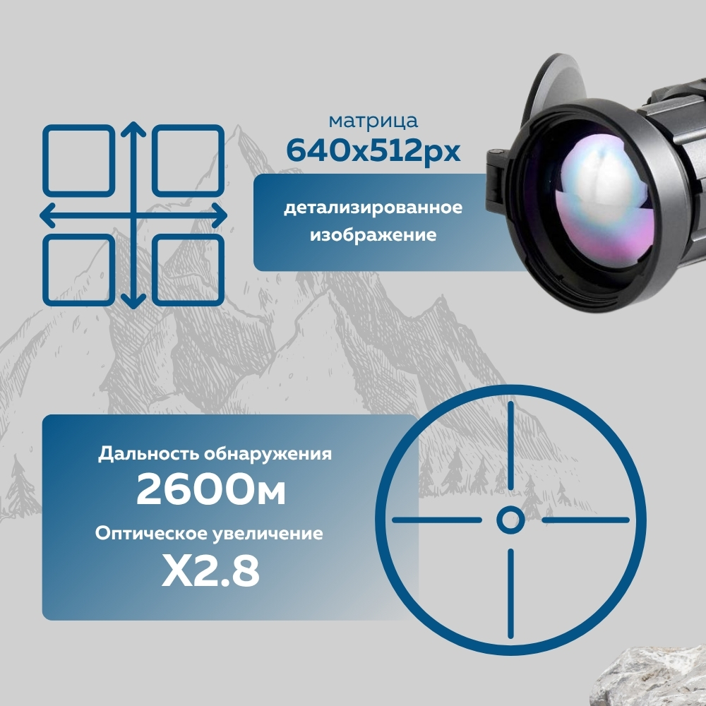 Разрешение 640×512 пикселей, 12 мкм: такие параметры гарантируют чёткое и яркое изображение, а также комфортную работу с цифровым зумом.
