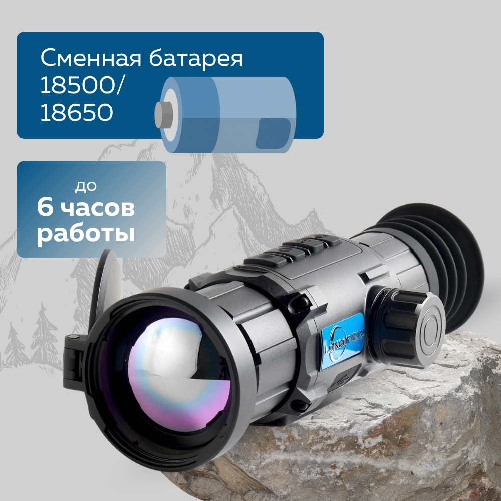 Прицел оснащён двумя аккумуляторами, обеспечивающим до 6 часов автономной работы.