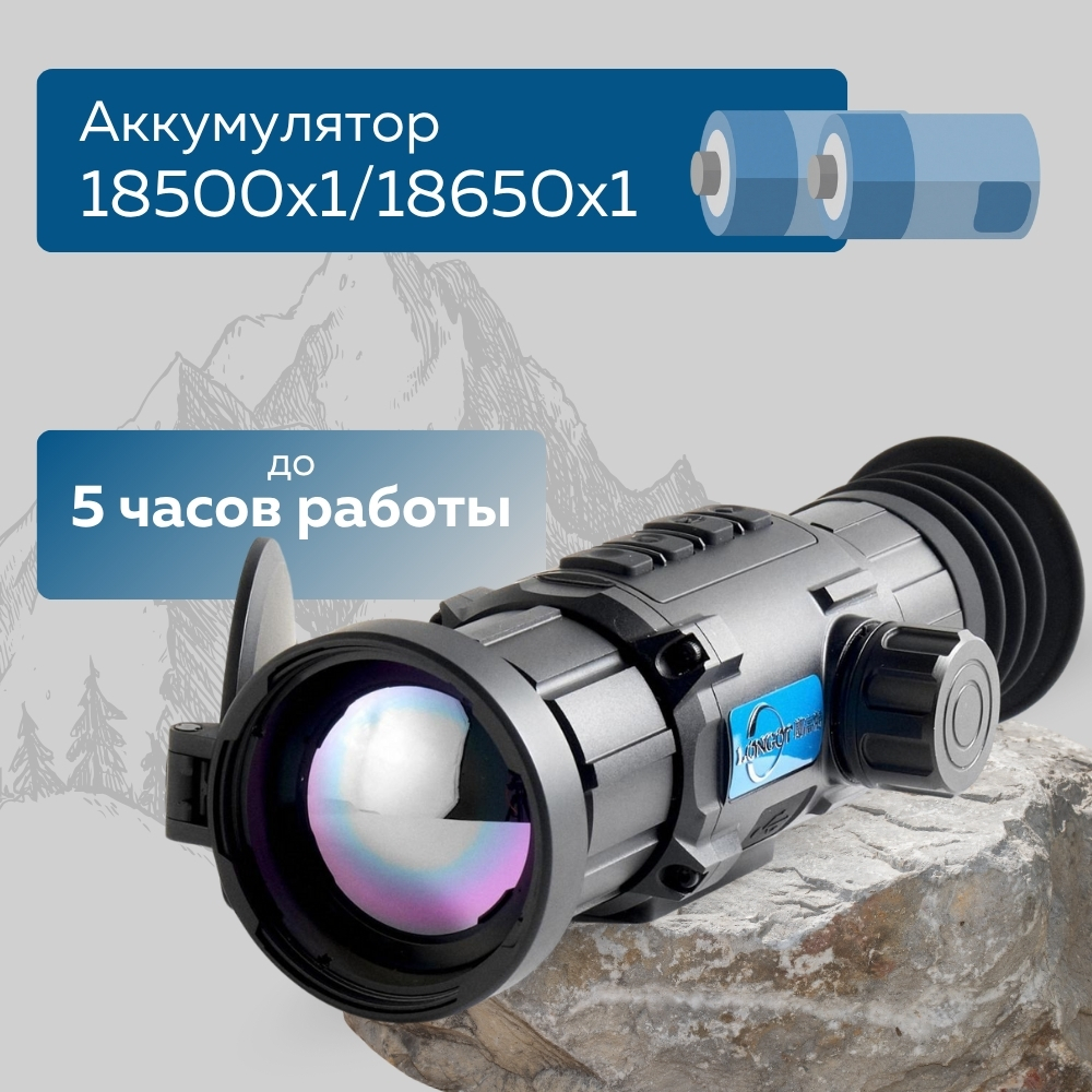 Прицел оснащён двумя аккумуляторами, обеспечивающим до 5 часов автономной работы.