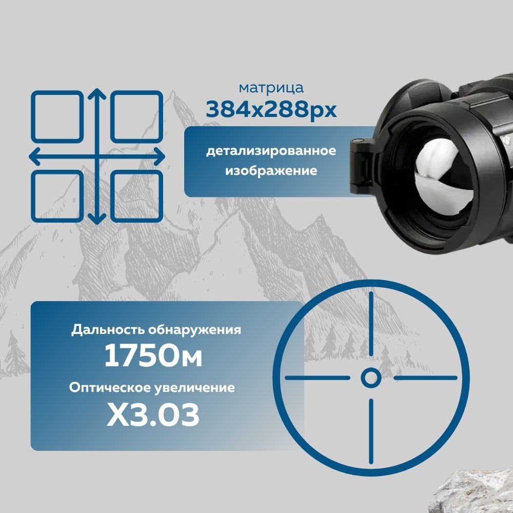 Оснащён матрицей Vox разрешением 384×288 пикселей и чувствительностью <35 мК, он отлично подходит для охоты на ближних и средних дистанциях, даже при низком тепловом контрасте.