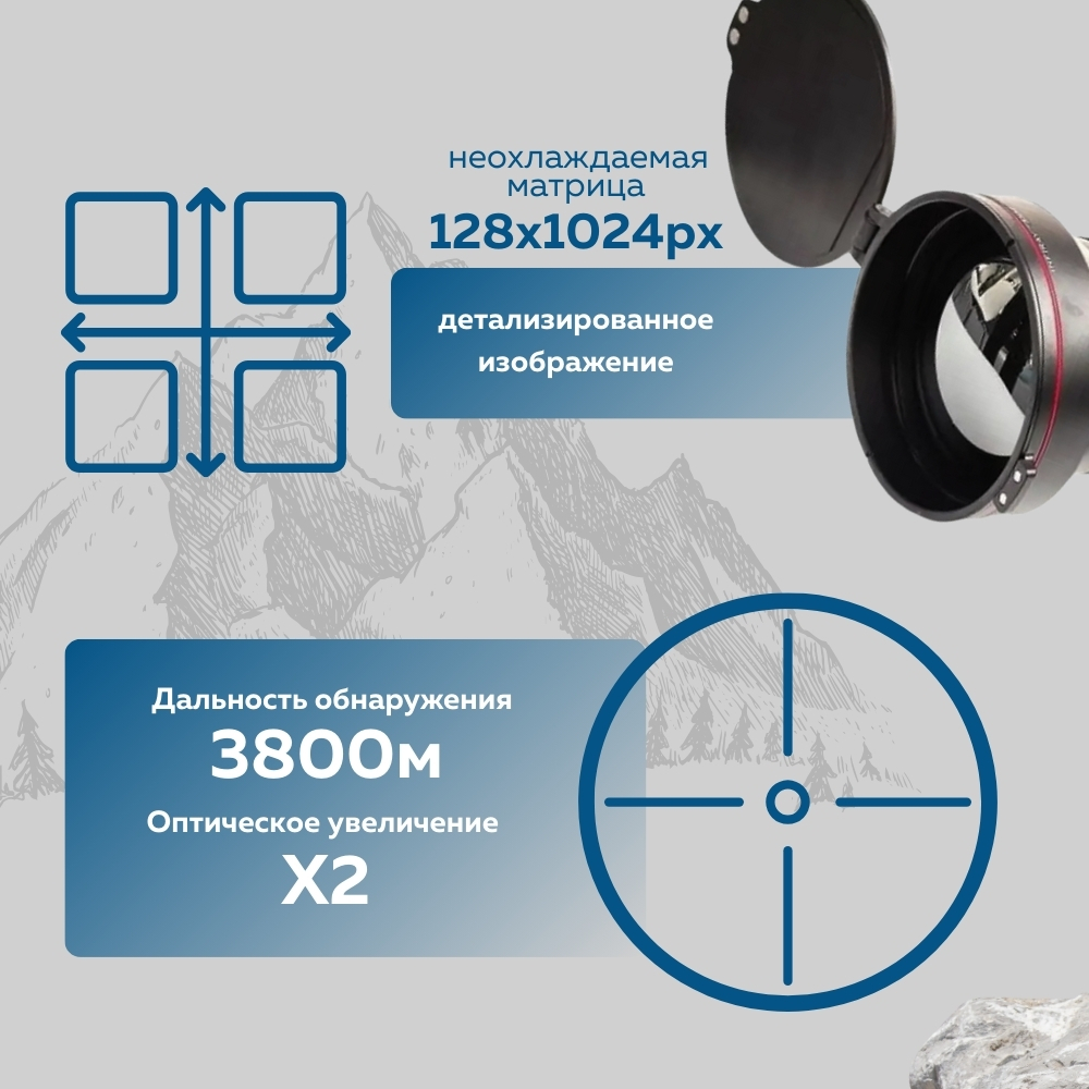 Оптическое увеличение составляет 2×, а цифровое достигает 8×. Совместное использование этих функций позволяет чётко идентифицировать цель и вести наблюдение в широком диапазоне дистанций.