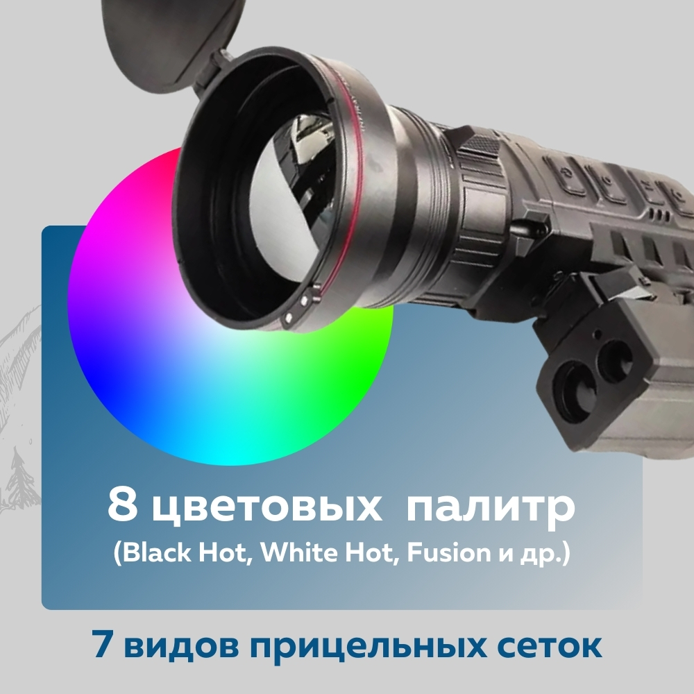 Поддерживает 8 цветовых палитр (включая White Hot, Black Hot, Red Hot, Fusion и другие), что позволяет подобрать оптимальное отображение под условия и задачи наблюдения. Для стрельбы доступно 7 видов прицельных сеток с возможностью выбора цвета — легко настроить отображение под предпочтения стрелка и различные типы оружия.