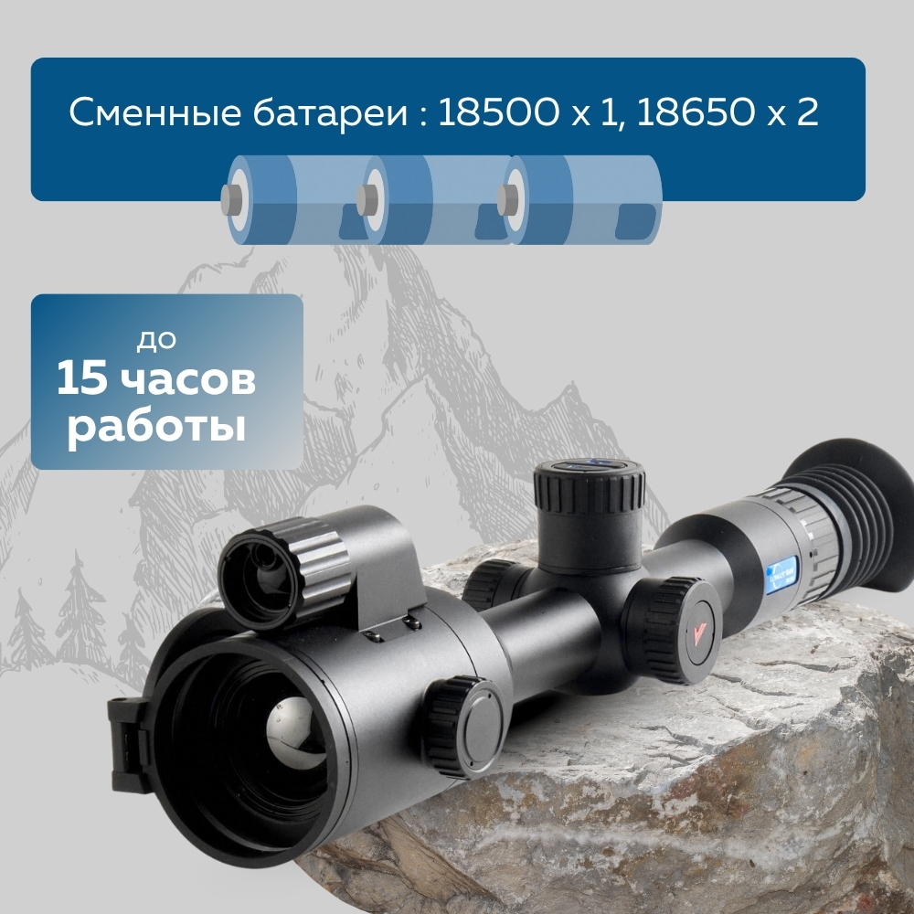 Благодаря использованию встроенного аккумулятора 18500 и двум сменным батареям 18650, а также опции подключения внешнего Powerbank, прицел способен работать до 15 часов без подзарядки.