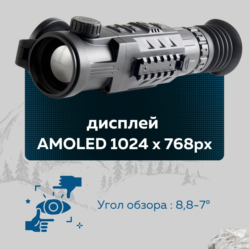 Объектив прибора даёт угол обзора 8.8° × 7°, что позволяет быстро оценивать ситуацию на местности и эффективно отслеживать движущиеся объекты.