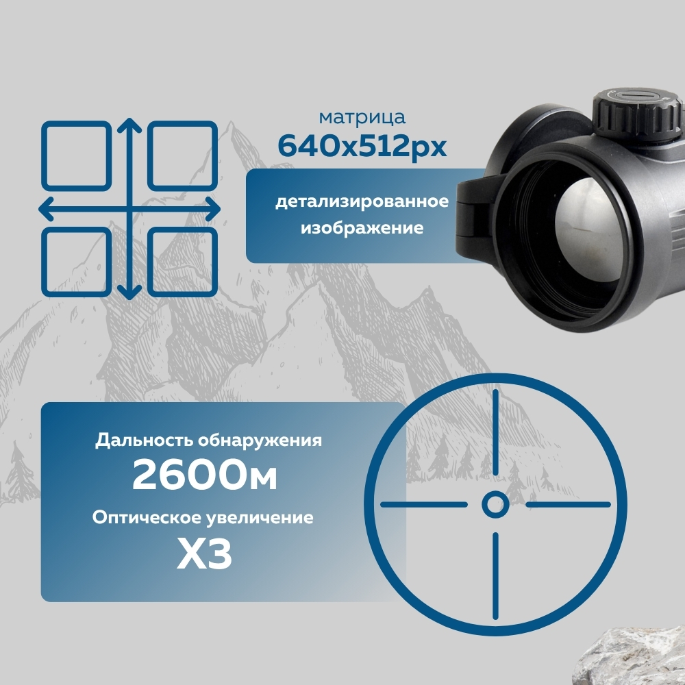 Прицел оснащён высокочувствительной тепловизионной матрицей с разрешением 640 × 512 пикселей и размером пикселя 12 мкм. Это обеспечивает отличную детализацию целей и высокую информативность изображения даже в условиях полной темноты, тумана или сильного дождя.