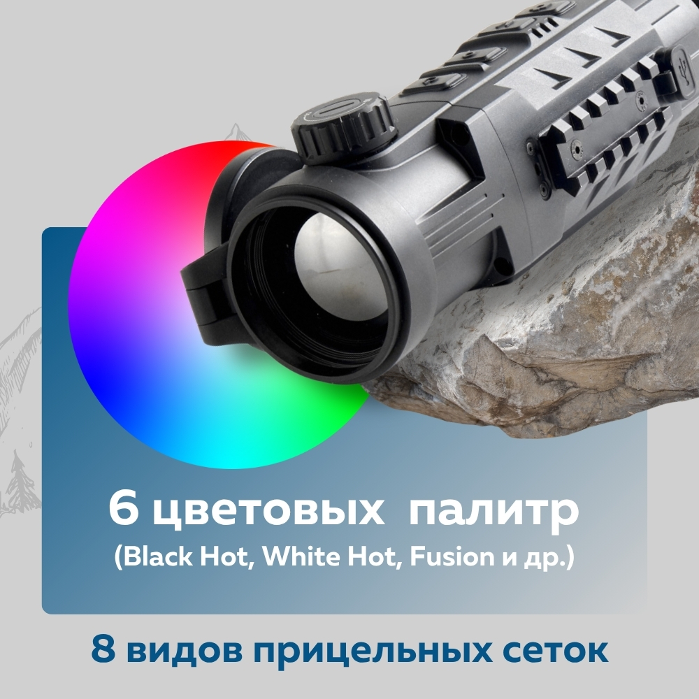 Для эффективной адаптации к любым условиям наблюдения предусмотрены 6 цветовых палитр: White Hot, Black Hot, Red Hot, Color, Iron Bow и выделение горячих объектов.
